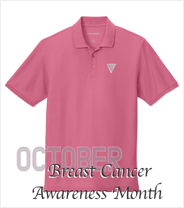 AWARENESS PINK Polo with Embroidered Classic Triangle Logo in White and Pink. Silky soft comfort meets ultimate performance in these polos that are durable and comfortable. Moisture-wicking 65/35 polyester/cotton classic pique that is wrinkle and shrink-resistant with a UPF rating of 20-40+. Easy care material features Fade-resistant with Anti-curl flat knit collar, 3-button placket, Dyed-to-match pearlized buttons, Flat knit cuffs, Side vents, Drop tail hem and a Tag-free label. Men's sizing but also great for the Ladies!