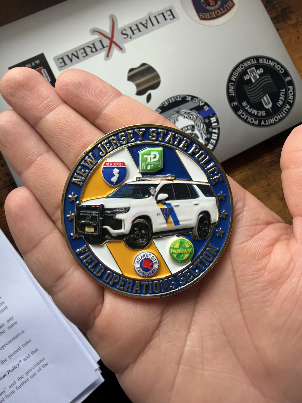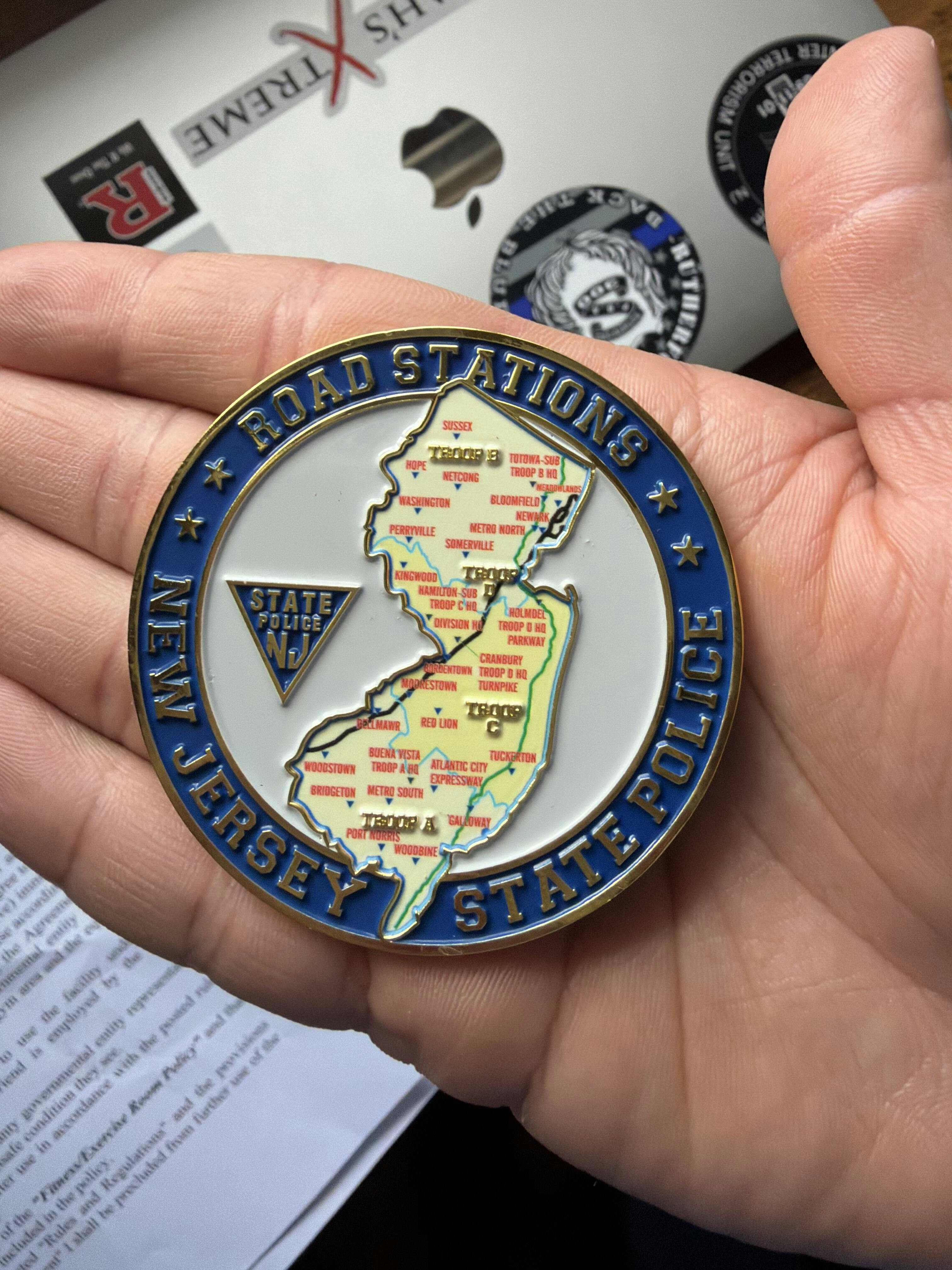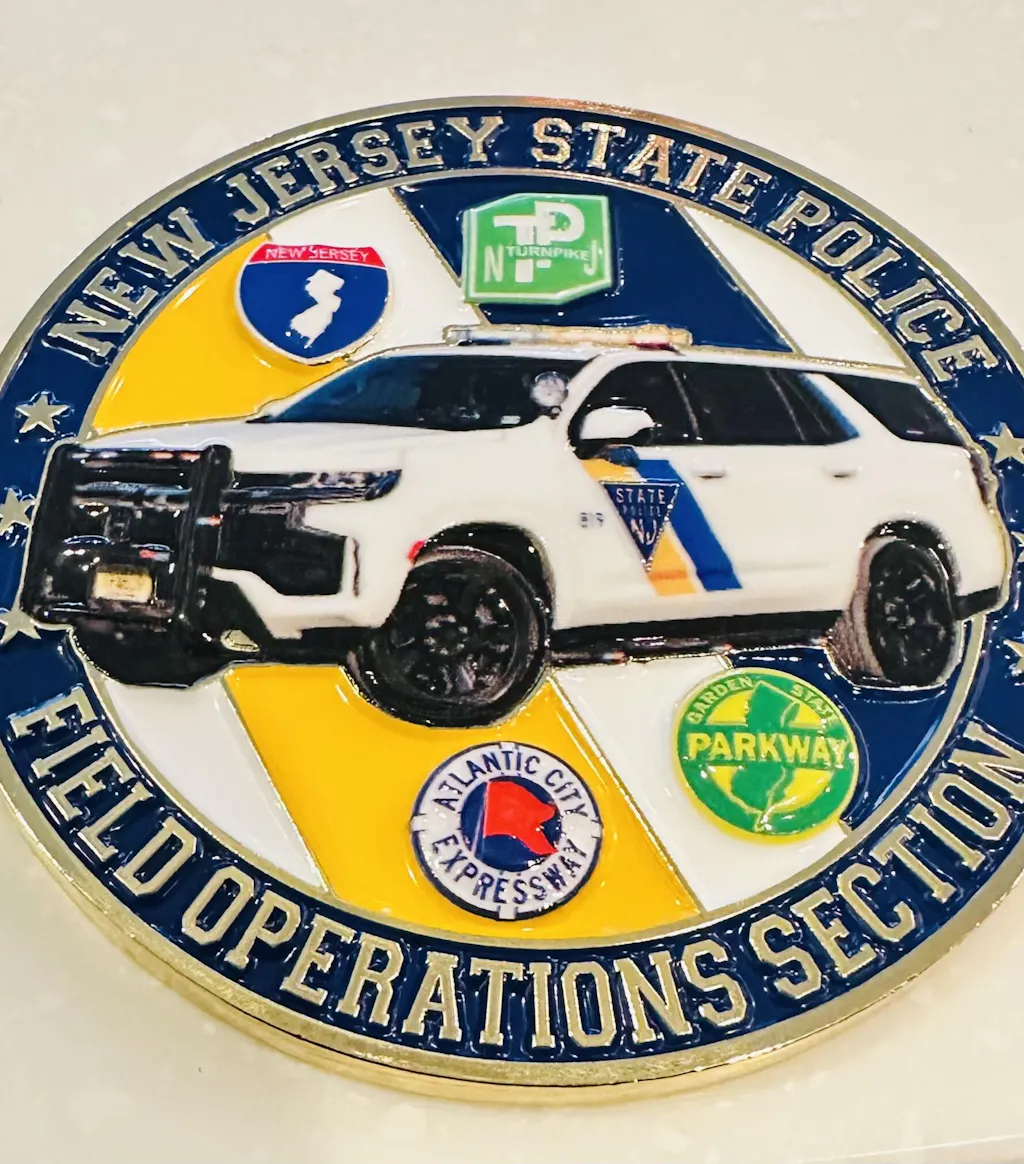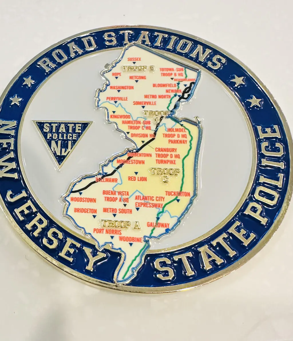The coin features amazing detail of a Marked Troop-Car Chevrolet Tahoe with roadway insignias on one side, and a New Jersey Map depicting the geographic locations of the four Troop areas, Troop Headquarters, and the Road Stations. Features Raised Polished Brass finishes with enamel fills and a 2.5 inch diameter. Comes in a plastic envelope.