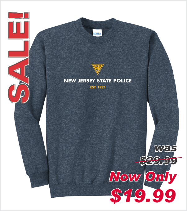 Coreweight Crewneck 50/50 cotton/poly fleece with Moisture-Wicking Properties and Tearaway Label. Durable and Comfortable. Printed with the Classic Triangle and NEW JERSEY STATE POLICE text in Gold and White.