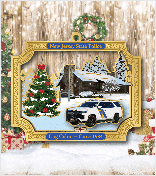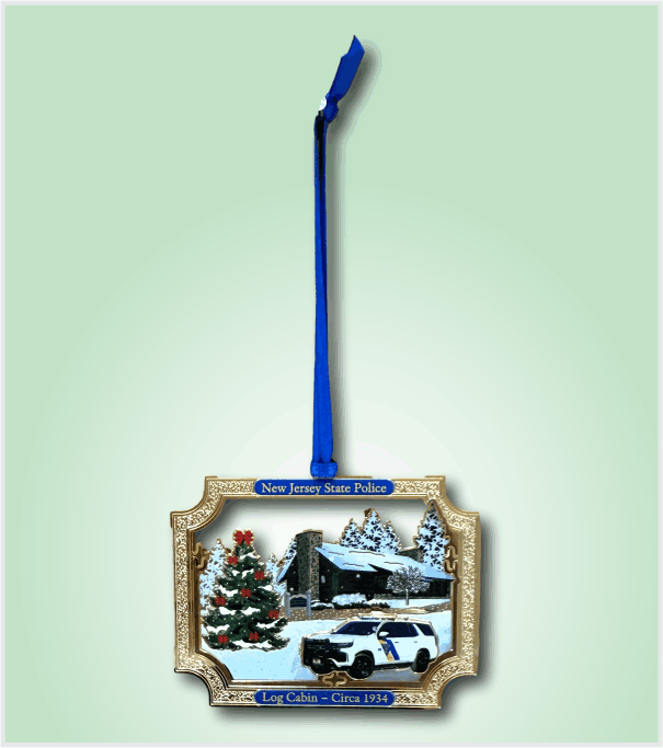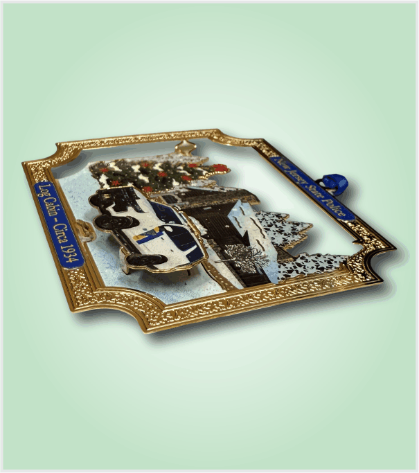Featuring the Division Headquarters Log Cabin Circa 1934 with a modern day Troop-car and winter setting. This amazing ornament is etched from solid brass with three tiers to produce a unique three-dimensional effect. Dimensions are 3.5 inches wide by 2.5 inches high with Blue hanging ribbon.
