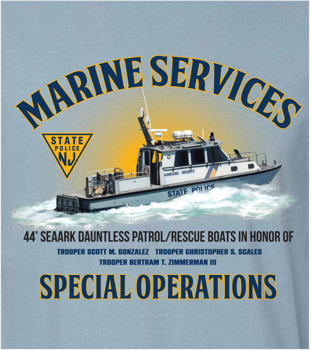 Premium Softstyle 80/20 ring spun cotton/polyester blend fleece Hooded Sweatshirt in Stone Blue and printed with Amazing Graphics of the 44’ SeaArk Dauntless patrol/rescue boat printed on the back. The three NJSP SeaArk Dauntless vessels are named in honor of fallen troopers, Scott M. Gonzalez, Christopher S. Scales and Bertram T. Zimmerman III, who all died in the line of duty. The left chest is printed with the MARINE SERVICES BUREAU logo.